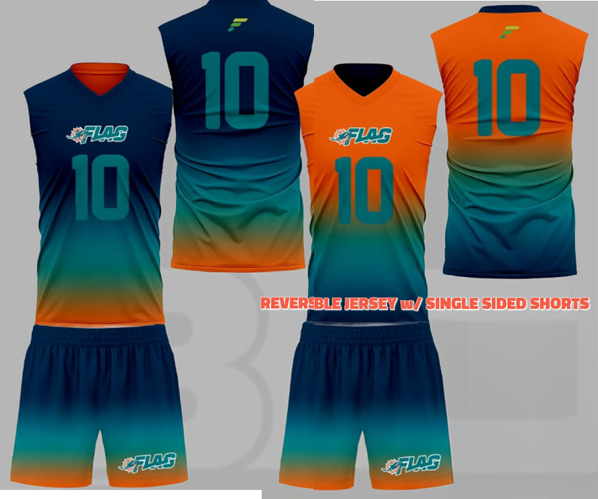 Reversible shirts, shorts, and official flag belts, headgear DOLPHINS SWAG BAG, and championship trophy for winners.